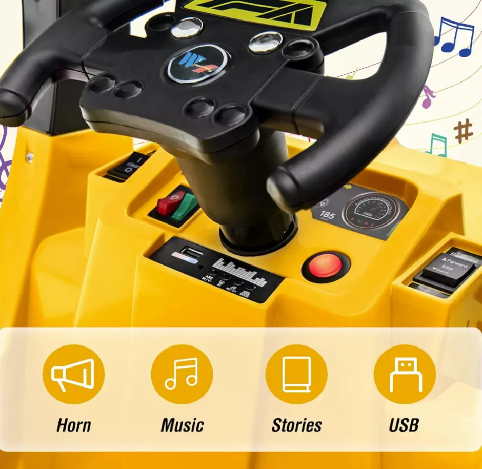 - Various Entertainment Functions: Simulated chimney and mobile rearview mirrors make it look more like a real street sweeper. Bright headlights, built-in music and horn add more fun to kid’s driving. Apart from that, USB port and MP3 player help to connect outside devices for more music.