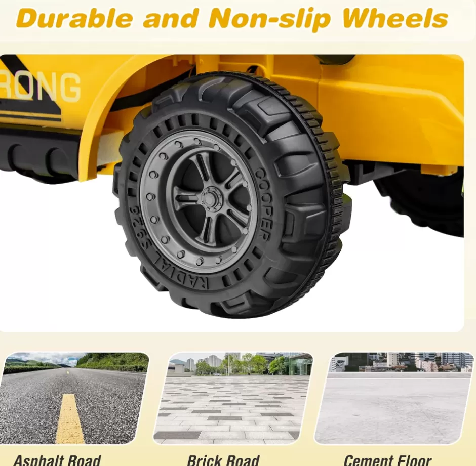 - Powerful Motors & Non-slip Wheels: 2 powerful motors(12V) and 1 12V built-in battery ensure a safe speed of 2-4 km/h. Plus, thanks to the non-slip wheels, our truck enables kids to smoothly ride on different road conditions, such as wood floors, brick roads, cement roads or asphalt roads.