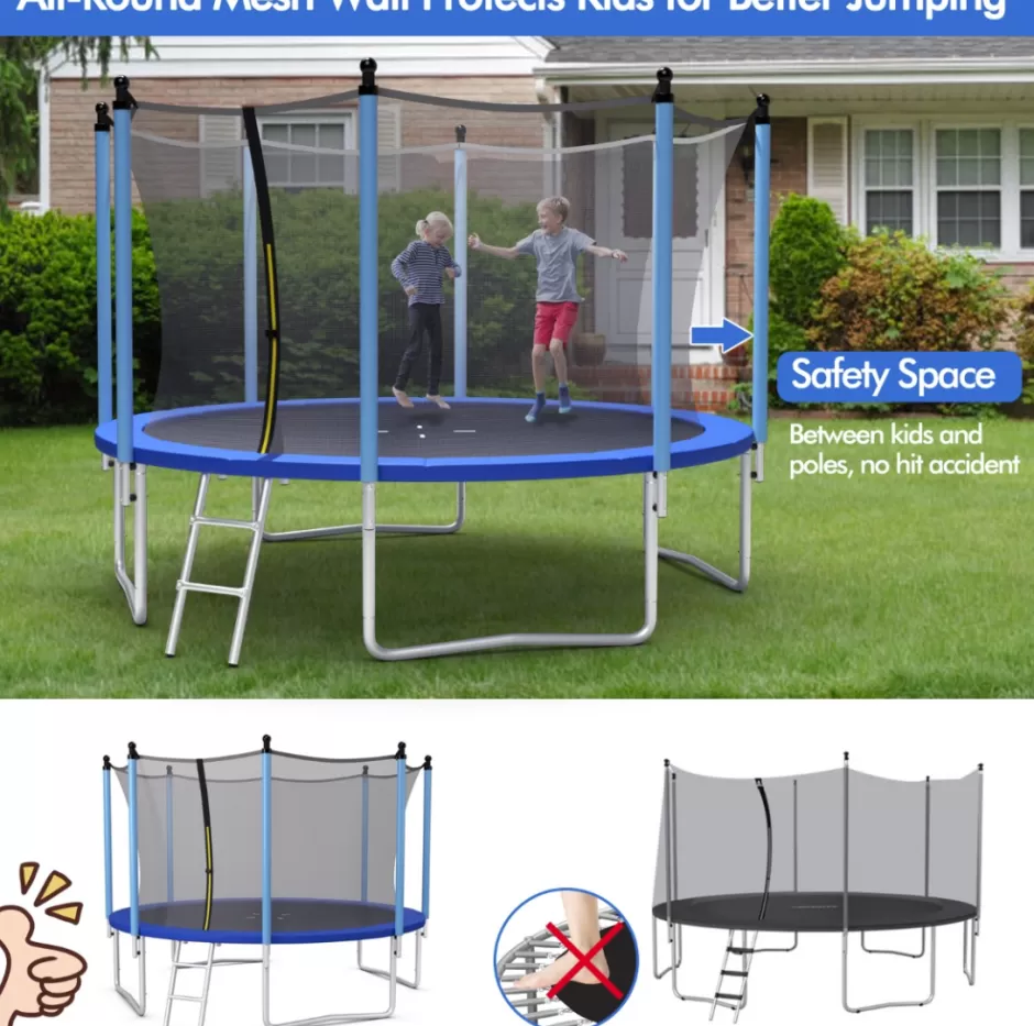 The 10/12/14 FT outdoor trampoline comes with heavy-duty steel pipes, protective foam sleeves, and 3/4 U-shaped foot tubes providing strong strength and stability. What’s more, the trampolines are rust-resistant and ultraviolet-resistant which allows you to enjoy outdoor jumping. And it is equipped with a high-resilient and wear-resistant jumping mat for providing excellent bounce, a tightly woven enclosure net to keep fingers and toes from getting caught, and long rust-resistant steel springs for safety. Other than that, the backyard trampoline comes with a ladder, dual zipper, and buckle-up closure system for kids to climb in and out easily. All in all, the trampoline is not only great for family activities to promote the relationship but also good for getting your blood pumping and your muscles moving, which will definitely be the best gift for your family!
