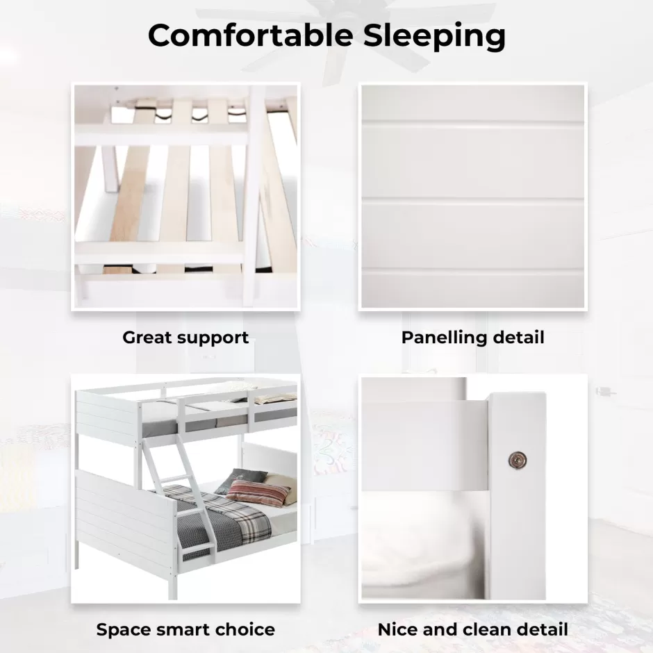 Your little ones deserve deep rest on a beautiful bed. Gift them this bunk bed designed in the contemporary shaker style. A panelling detail on head and foot board gives it a charming look. A bunk bed is helpful when you want to create some extra space in your bedroom. This bed is made of child-friendly materials including Rubber Wood, MDF LVL Poplar, all sustainably harvested. The materials ensure the softness of the bed surface while giving it the robustness it needs.The LVL Poplar wood provides the bed with lightness, strength, and shock-resistance. The MDF wood is resilient to moisture damage, and the rubber wood keeps the bed surface weather-proof, keeping children happy in all seasons. The bunk bed is �Furntech Certified� which means you can have peace of mind after bringing it home.The single over double bed has a 3-step wooden staircase attached for the convenience of children. The top part of the bed can accommodate up to 100 kg, while the bottom part can handle 200 kg. Also, the beautiful bed in white finish looks cute in a variety of interior decor styles. The bunk bed comes with a one-year warranty. The best part is that the bunk bed is easy to assemble.