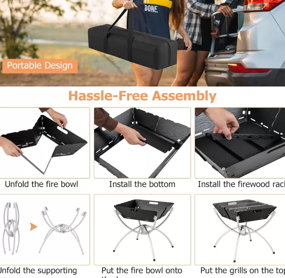 - Portable Campfire Grill: When not in use, the fire pit can be disassembled and folded, which can be put into a compact carrying bag measuring only 60 x 15 x 15 cm (L x W x H). Therefore, you can carry or store it anywhere without effort.